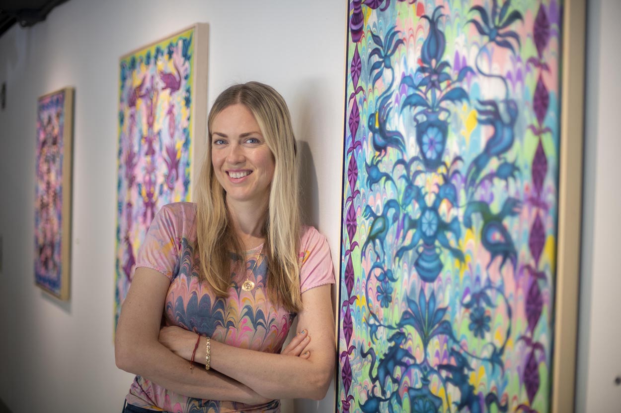 Nora McMillen Burke is a visual artist and textile designer known for her colorful, pattern-forward paintings inspired by the natural world and her love of antique textiles and folk art. Born in Austin, TX, Nora studied textile design at the Fashion Institute of Technology before establishing a career in art education. Now she works primarily with watercolors , often combining dye and marbling techniques. Her art work examines symmetry, pattern, flora and fauna and highlights common symbolism found throughout global embroidered textile traditions. She launched her hand painted, sustainably printed wallpaper collection in 2023 and added textiles in 2024. Nora lives in Austin with her husband and three children.